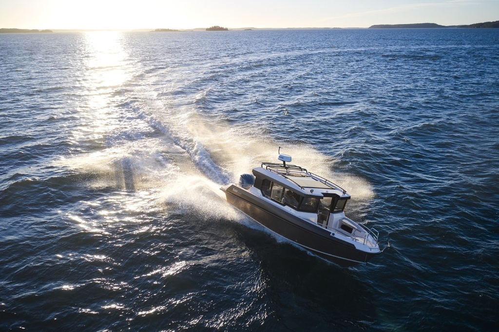 Suuret ikkunat ja iso kattoluukku tuovat hyttiin avoveneen avaruutta. Ergonominen ohjauspaneeli ja fiksu tilankäyttö takaavat mukavia matkoja niin kuljettajalle kuin muille matkustajille. Säilytystilaa on paljon ja liikkuminen helppoa sekä hytissä että kannella. Vene sopii mainiosti yhteysveneeksi ja retkiveneeksi, ja sen voi lisävarusteilla muunnella juuri omiin tarpeisiin sopivaksi.
