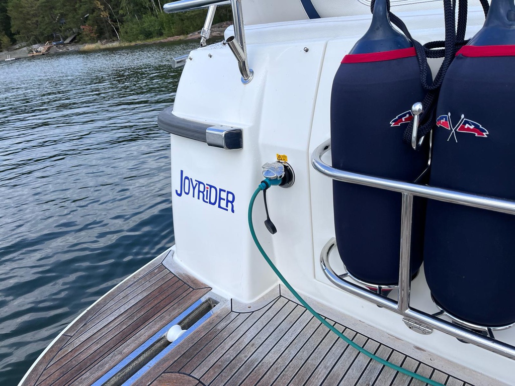 Sähkö- ankkurit edessä ja takana, keulapotkuri, maasähkö, invertteri, lämmitys, sähköinen katonavaus, petauspatjat, 2 jääkaappia, liesi ja grilli yms, yms.