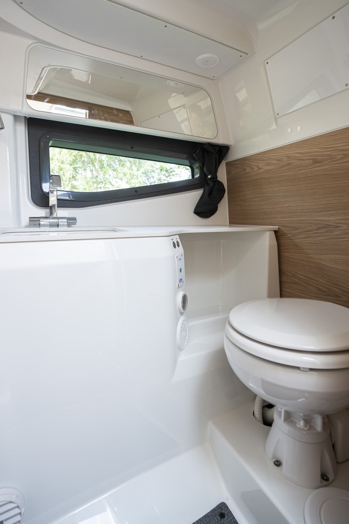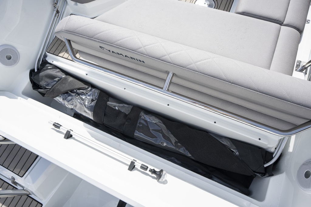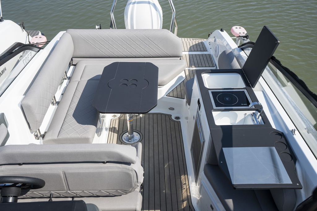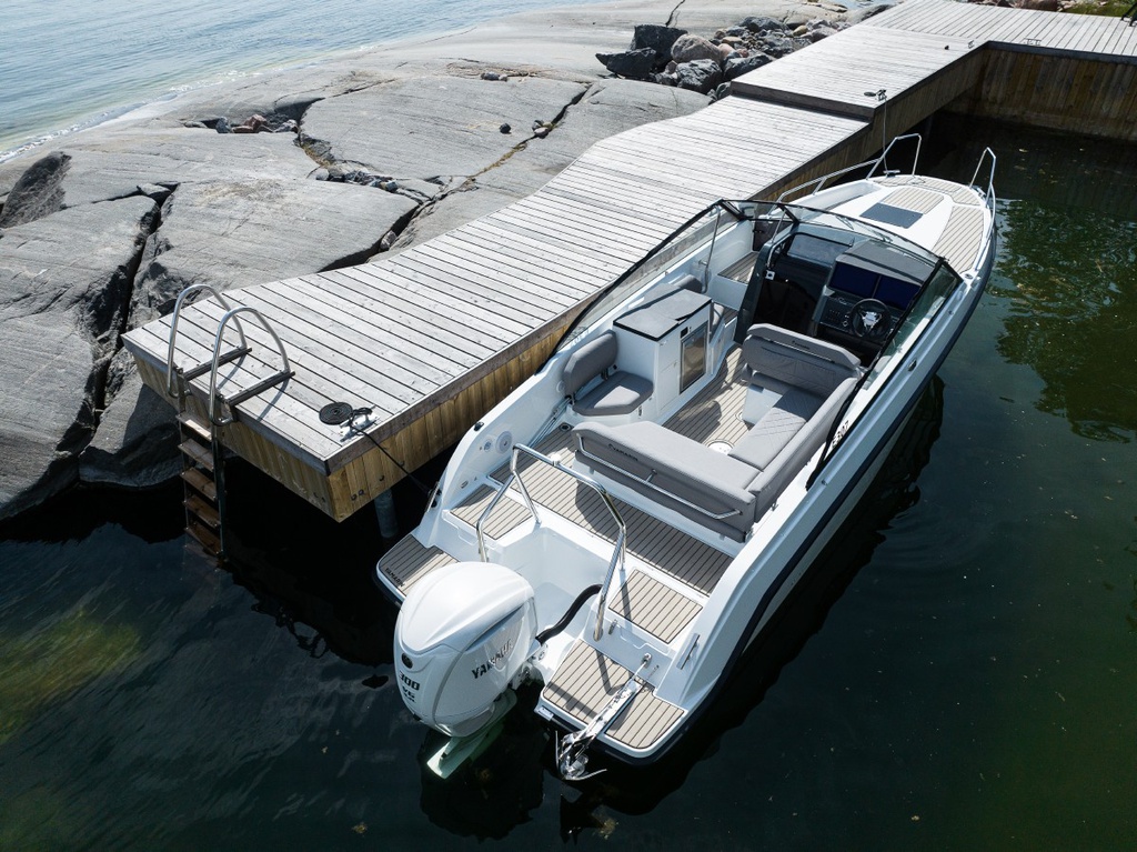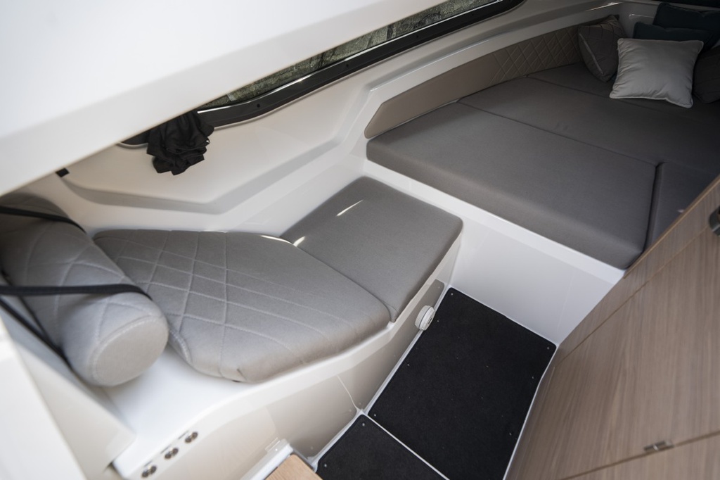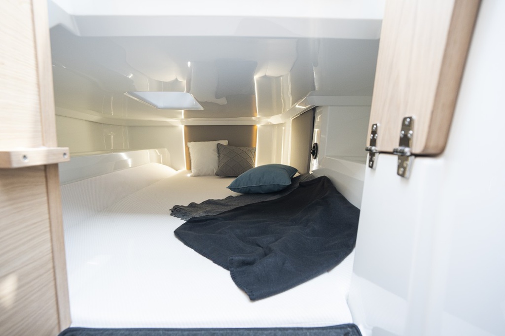 Sivulla, paapurin puolella, on perinteisistä daycruisereista poiketen kulku keulakannelle, jonka ansiosta veneeseen astuminen ja veneessä liikkuminen on erittäin helppoa ja turvallista. Tämän lisäksi isot sosiaaliset tilat, valoisa hytti, tilava mid cabin, isot uimatasot sekä loppuunsa hiottut ajo-ominaisuudet tekevät tästä uutuudesta mainion kumppanin päiväretkeilyyn ja pidemmillekin matkoille. Mukaan matkalle mahtuu jopa kymmenen henkilöä.